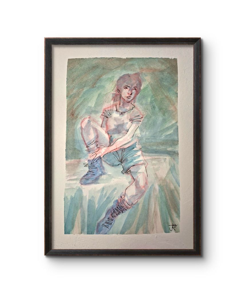 Esta acuarela formará parte de una serie de tamaño A4 en papel de 300 gr. dedicada a la humanidad. Personas realizando tareas o en momentos senzillos donde reside una belleza especial. Esta en concreto se llama “botas nuevas”.